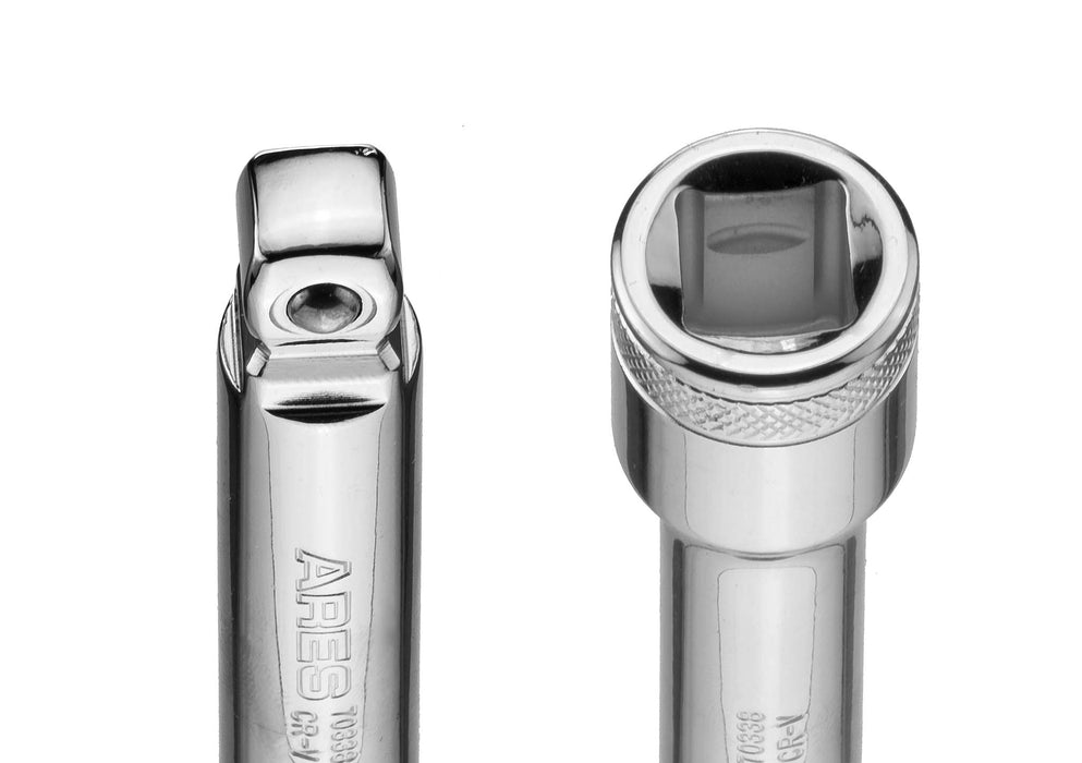 El juego de extensiones de 9 piezas para llaves de vaso ARES le proporciona todas las extensiones de 1/4 de pulgada, 3/8 de pulgada y 1/2 pulgada que necesita para acceder a espacios reducidos y estrechos, de manera recta o en ángulos irregulares. Estas extensiones, fabricadas con acero al cromo vanadio tratado térmicamente de alta resistencia y con un acabado niquelado/cromado resistente a la corrosión, le permiten insertarlas parcialmente en los dados para uso con llaves de vaso o insertarlas completamente para uso regular, mientras que la bola de retención accionada por resorte garantiza que permanezcan seguras.