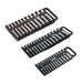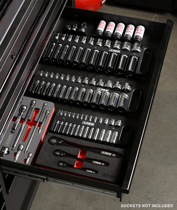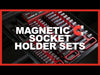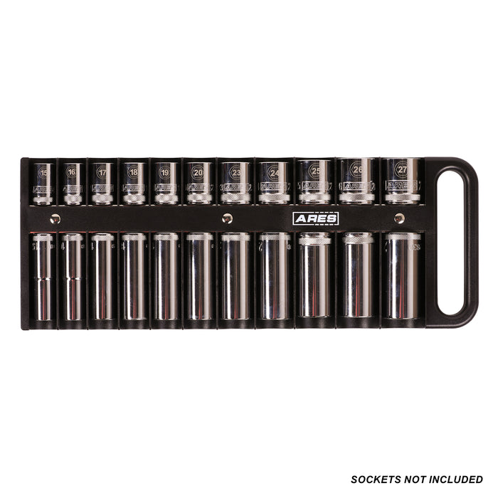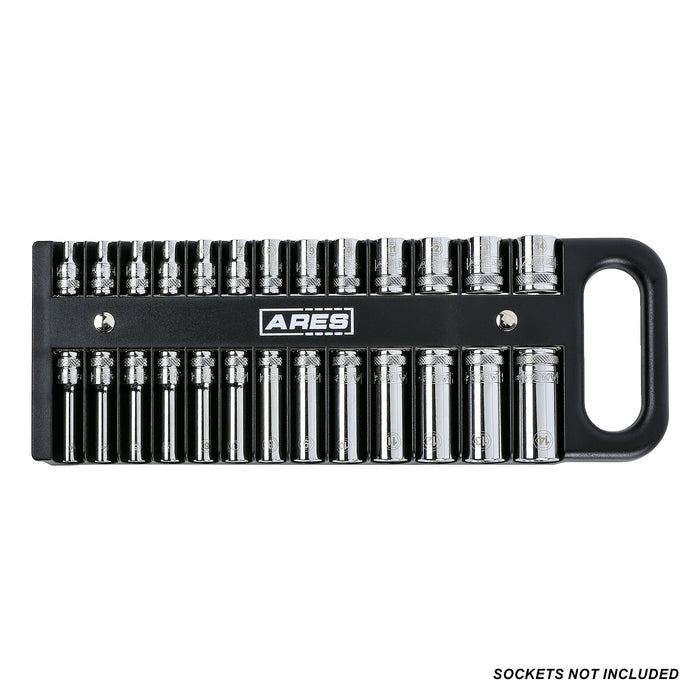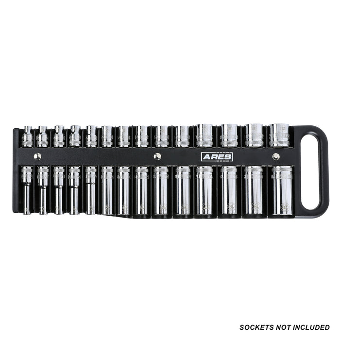 The ARES 3-Piece Black Socket Holder Set has a place for 38 shallow and 38 deep sockets, so you can store and organize all of your favorites, both SAE and metric, in one convenient place. This socket holder features strong magnets to keep your sockets firmly in place, so you'll never have to go searching for them in your tool box, and there's even room for socket sizes up to 1 - 3/16inch or 30mm. Thanks to the handle, you can quickly and easily take your sockets anywhere.